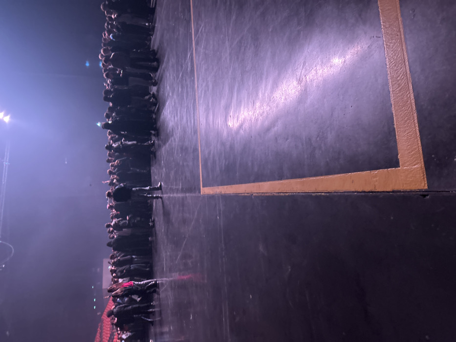 A large group of people stand in a line against a wall. The wall is black with a gold painted corner, suggesting a stage or athletic space. The lighting is dim, with a light source coming from the left side, casting long shadows of the people onto the wall. The people are all dressed in dark clothing. The overall impression is of a formal gathering.