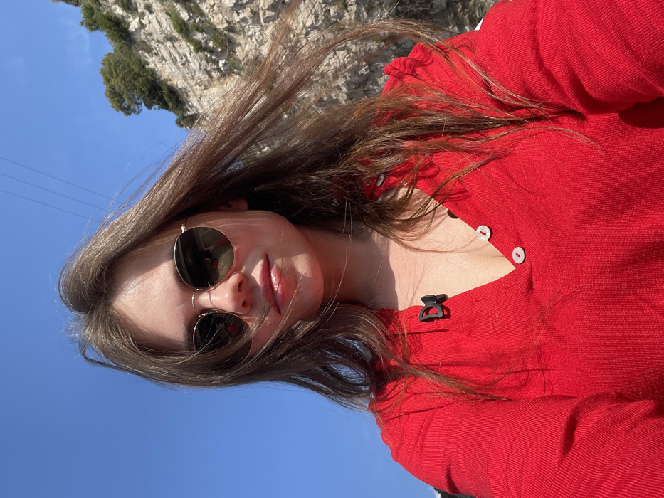 A young adult female is depicted in a close-up, selfie-style outdoor photograph taken in Meta, Italy. She has long brown hair, which appears wind-swept, and wears gold-rimmed, dark-lensed round sunglasses. Her lips are slightly parted in a subtle smile. She is wearing a red, long-sleeved top with a partial button placket featuring several light-colored, possibly pearl, buttons. A small black butterfly-shaped clip is affixed to her garment on the left side of her chest. The background features a clear blue sky. To her right, a large, light-colored rocky cliff face with some green vegetation at its summit is visible. Thin, dark overhead lines traverse the upper portion of the sky. The scene suggests a coastal or elevated vantage point within Meta.