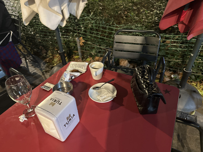 - "A red outdoor table is set with a glass, a white Turia box, an ashtray, loose tobacco, a cup of coffee, a saucer with a spoon and sugar packet, and a black purse" by FM-wv6yi1, licensed under CC BY 4.0
