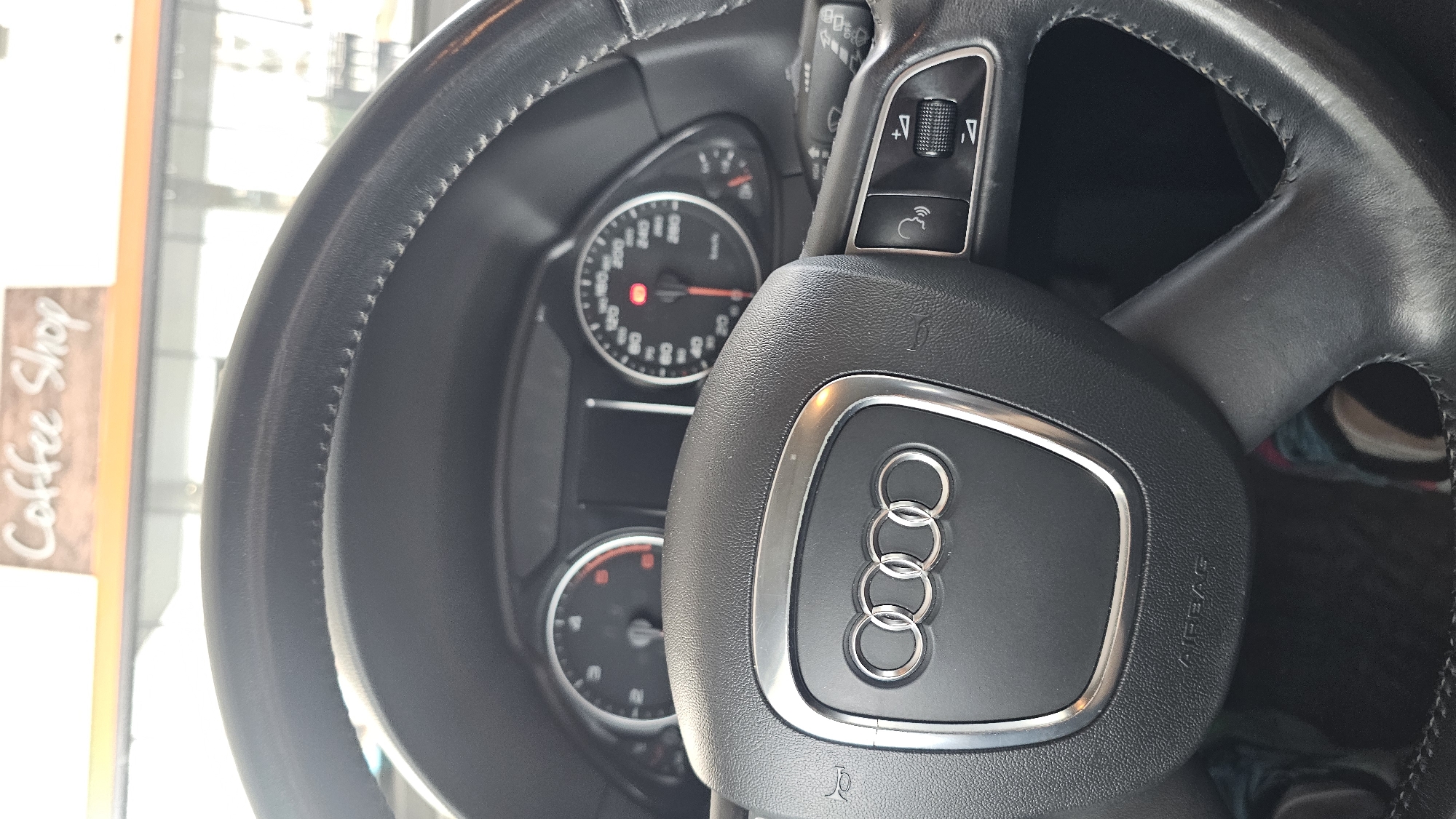 The image presents a view from the driver's seat inside an Audi vehicle, looking forward