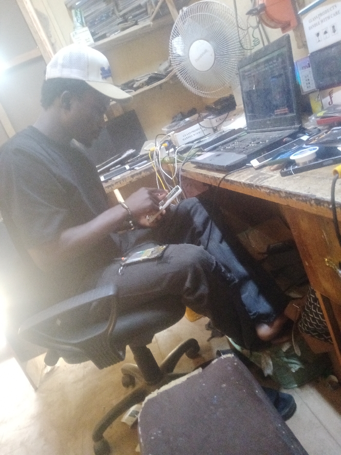 A man wearing a cap and dark clothing sits in an office chair at a cluttered desk, focused on repairing a mobile phone