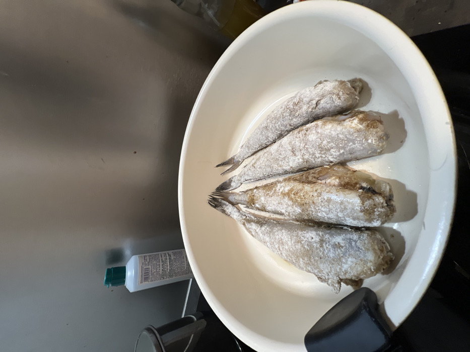 A white bowl contains four fish, seemingly prepared for cooking. The fish are coated in a white powdery substance, potentially flour or a similar ingredient for frying or baking. They are arranged in a somewhat haphazard manner within the bowl. A bottle of cleaning product sits on the counter to the left of the bowl. The background includes a metallic surface, possibly a sink or countertop, and some black elements indicating a nearby stovetop.