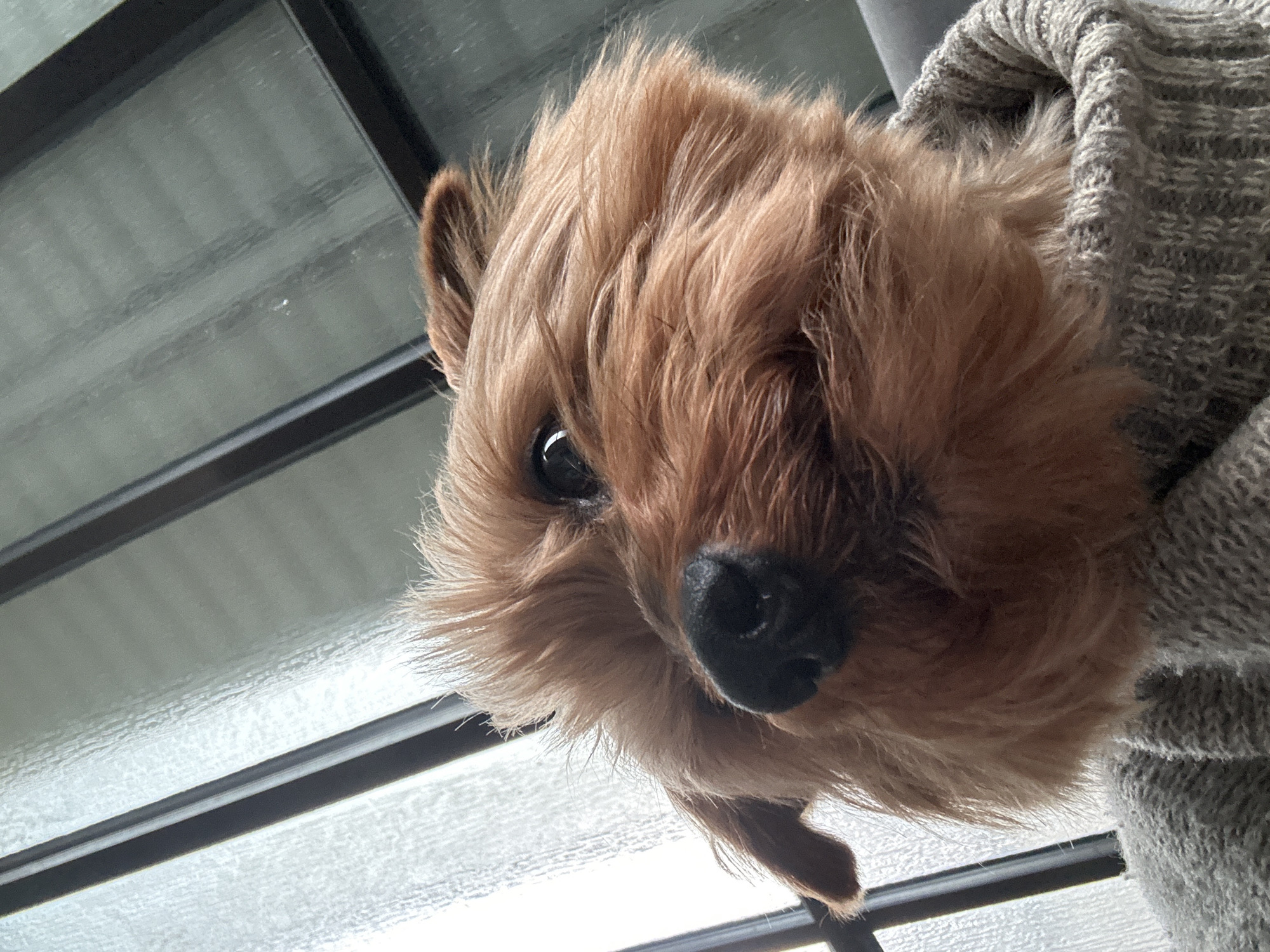 A low-angle, close-up photograph captures the head and upper body of a small, reddish-brown, fluffy dog, identified as the primary subject, in an indoor setting in Ramat Gan, Israel. The dog exhibits dark eyes and a black nose, with its fur appearing somewhat unkempt on the top of its head. It is partially enveloped by a light grey, ribbed knit garment, likely a sweater or blanket, visible around its chest and neck. The background features a window with two vertical dark frames. The window panes consist of frosted or textured glass, diffusing external light and obscuring any outdoor view.