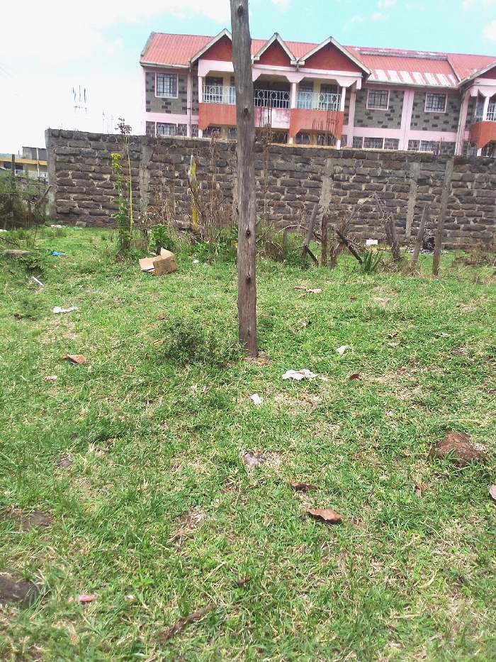 This image displays an outdoor scene in Nakuru, Kenya, centered on a grassy area backed by a stone wall and a residential building. The foreground features an unkempt expanse of green grass with scattered litter, including a light brown cardboard box, several pieces of white paper or plastic, and dried brown leaves. A single weathered wooden utility pole stands vertically in the grass, slightly right of the center. Behind the grassy area, a dark stone wall, constructed from irregular blocks, runs horizontally across the midground. Sparse, dry vegetation and several rough wooden posts, possibly part of a rudimentary fence, are visible immediately behind the wall. In the background, a multi-story residential building dominates the skyline. This structure has a reddish-brown corrugated metal roof featuring multiple gables. Its walls are a light pink or peach hue, accented by dark, stone-patterned frames around numerous windows. Several balconies with white, ornate metal railings extend from the upper floor. The sky above is partially cloudy, showing a mix of blue and white. No individuals are visible in the scene.