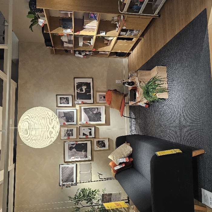 A top-down perspective shows an organized interior space. A wooden bookshelf is positioned near a gray rug, adjacent to a wooden table with a plant. The wall is adorned with several framed pictures. A gray sofa with pillows and a tag completes the arrangement. A round hanging lamp provides illumination to the space.