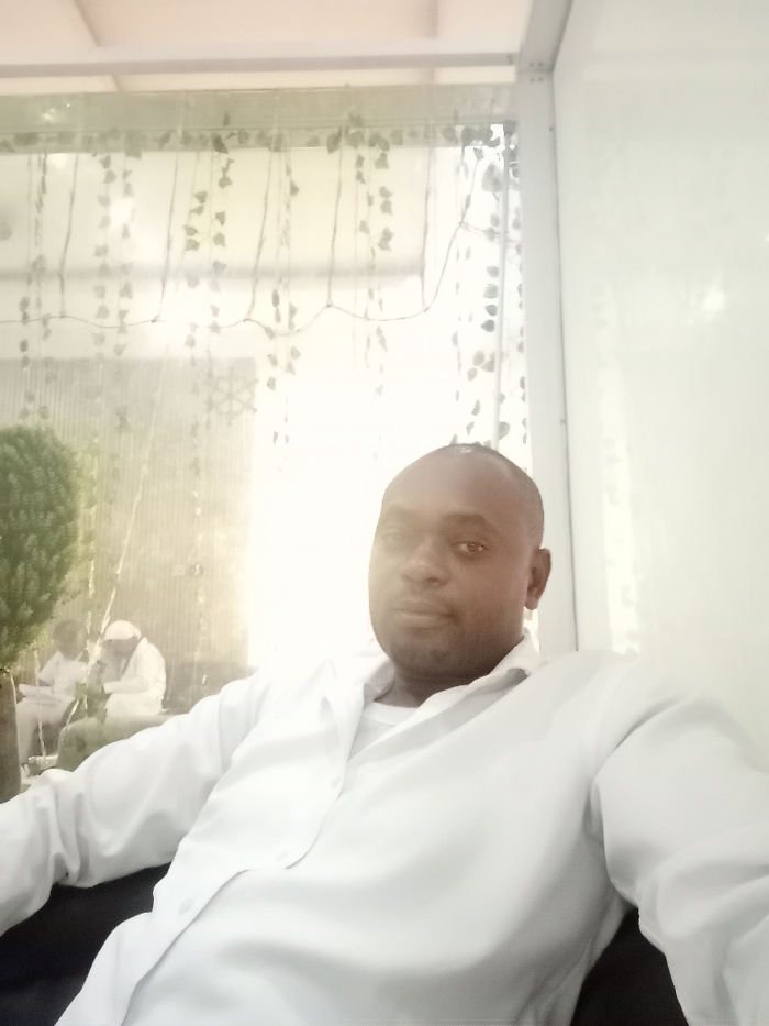 The image displays an indoor scene featuring one primary subject and two blurred figures in the background. The main subject is a dark-skinned adult male with a bald head and short dark stubble, wearing a white long-sleeved collared shirt unbuttoned at the top, over a white undershirt. He is seated, facing forward with a neutral expression, positioned in the foreground and center-right of the frame. To the left, a green spherical plant or topiary is partially visible. In the background, two indistinct figures in light-colored attire are seated or standing; one figure wears a white head covering. The background also includes a large window or glass partition covered by a sheer white curtain featuring artificial green leaf garlands. Bright light diffuses through this curtain. A plain white wall is visible on the far right. The setting suggests a commercial or public indoor space, such as a lounge or waiting area. There are no specific visual identifiers within the image to confirm a precise location within Gwarinpa, Nigeria.