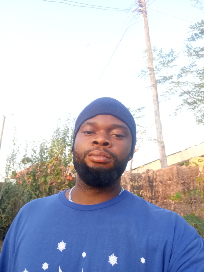 An adult male with dark skin, a full black beard, and a mustache is depicted in a close-up portrait. He wears a dark blue knit beanie and a blue t-shirt featuring white snowflake-like patterns, with a silver-colored chain visible around his neck. His eyes are directed at the camera, and his lips are slightly pursed. The background, consistent with an outdoor setting in Narayi, Nigeria, includes a light, clear sky, green and reddish-brown foliage, a tall wooden utility pole with wires, and a rough-textured brown wall or structure. Lighting conditions suggest either early morning or late afternoon.