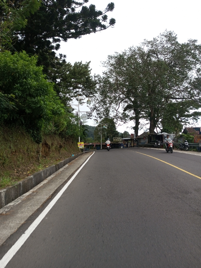 A street scene in the city of Phoxay, Laos, depicts an asphalt road with a slight curve to the right in the distance. The road features a solid white line along its left edge and a broken yellow center line. On the left side of the road, a concrete curb and gutter system separates the pavement from an earthen embankment covered in dense green foliage. Above this vegetation, dark green conifer-like trees extend into the upper left quadrant of the frame. Further along the left side, a white utility pole with multiple horizontal arms supporting several lamps and a satellite dish is visible. Adjacent to the pole, a yellow sign with red lettering is partially observable. Beyond the pole, small commercial structures or stalls with rudimentary construction are present. A dark-colored scooter, driven by a person wearing a white helmet and light jacket, travels away from the viewer in the left lane. The right side of the road is dominated by a large, mature tree with a broad, dense green canopy and thick branches, partially obscuring the sky. Behind this tree, more small buildings are visible, some with corrugated metal roofs. Several parked motorcycles are situated in front of these structures. Closer to the foreground on the right, a person on a red and white scooter, wearing a light-colored helmet, travels towards the viewer in the right lane. The sky is overcast or bright white. Distant hills are visible on the horizon, indicating a mountainous or hilly environment.