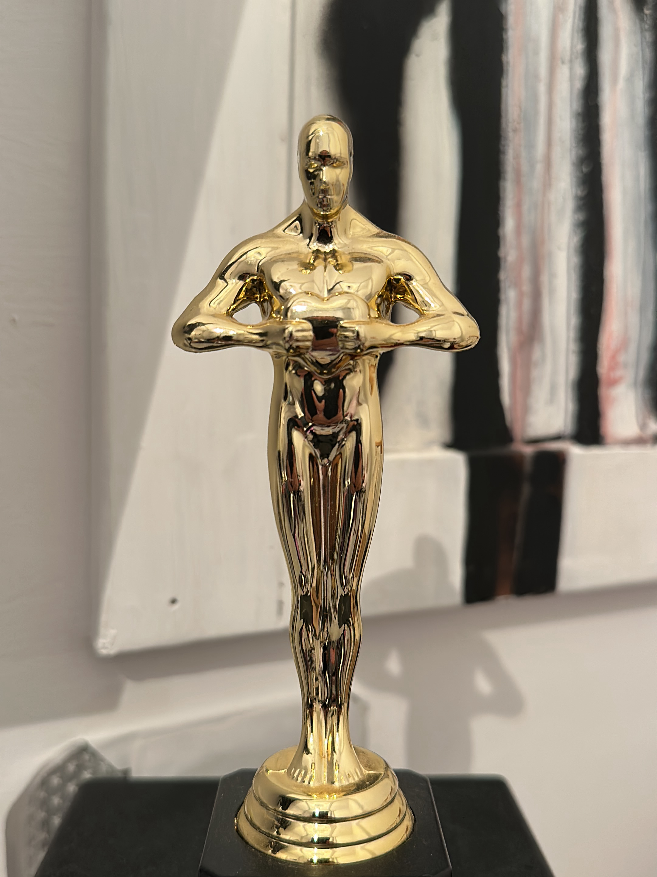 The scene depicts a golden statuette, approximately 20-30 centimeters tall, standing on a dark, square base, positioned indoors in San José del Valle, Spain. The statuette features a stylized human figure, akin to an Academy Award trophy, with both hands holding a heart-shaped object at chest level. Its surface is highly reflective. In the background, a white wall is visible, upon which an abstract painting or artwork is displayed, characterized by prominent vertical black and white brushstrokes, interspersed with subtle reddish-brown or pinkish streaks. To the left of the statuette, a vertical white architectural element, possibly a door frame or wall corner, is partially visible. No individuals are present, and no actions or interactions are depicted.