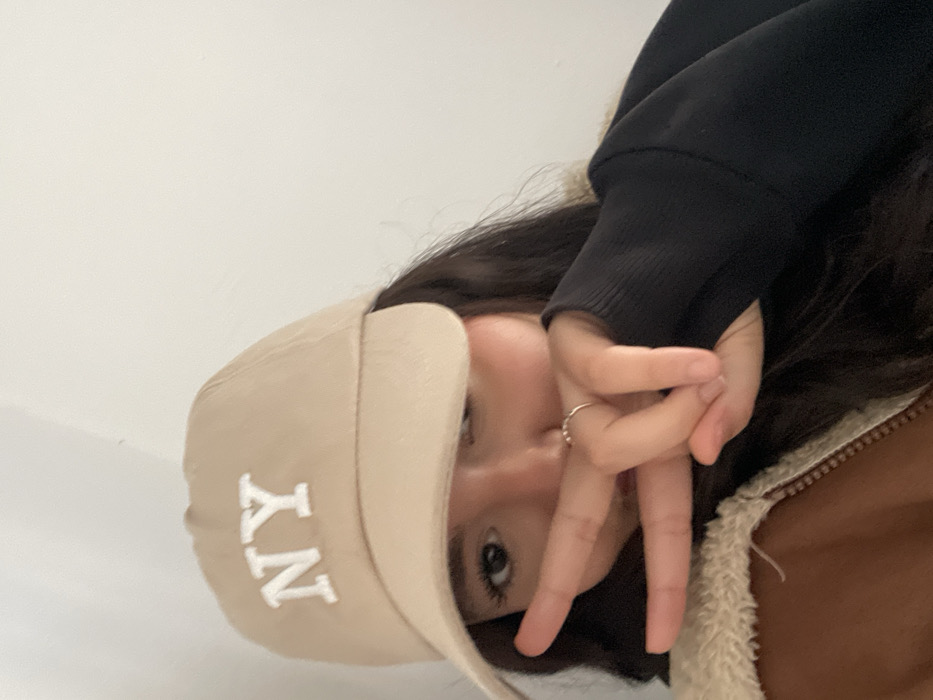 The image depicts a close-up, angled view of one individual. The subject wears a beige baseball cap with "NY" embroidered in white letters on the front. Dark hair frames the visible right side of the face. The right eye is open, while the left eye is largely obscured by the cap's brim. A silver ring is present on the ring finger of the individual's left hand, which is raised in a "V" or peace gesture, with the palm facing the camera. This hand partially covers the lower portion of the face, including the nose and mouth. The individual is dressed in a black long-sleeved garment, partially visible on the right, and a brown jacket with a cream-colored fleece or sherpa-style collar and lapel, visible on the lower left. The background is a plain, light-colored, undifferentiated wall, indicating an indoor setting. No specific geographical landmarks or city features of Fez, Morocco, are discernible in the visual content of this image.