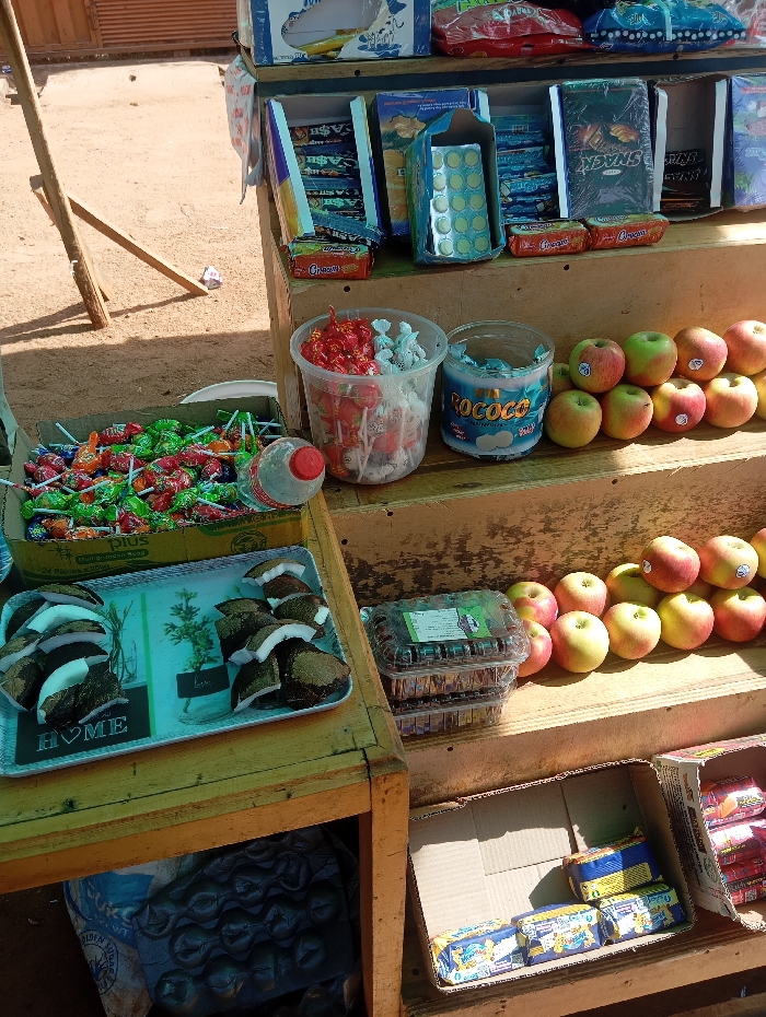 This image depicts an outdoor market stall in Barakin Gangare, Nigeria, featuring a multi-tiered wooden display unit under bright daylight. The ground is visible as light brown, dusty soil. On the top shelf, various packaged goods are arranged, including boxes of snacks, a blister pack containing small, circular white tablets, and several items in transparent plastic bags. The middle shelf, from left to right, shows a cardboard box filled with numerous individually wrapped lollipops of various colors, a plastic bottle with a red cap lying on its side, and two clear plastic buckets. One bucket contains red and white individually wrapped candies, while the other, labeled "Rococo," holds light blue candies. To the right, a neat stack of red and green apples is displayed. The lower shelf features a silver tray with a "HOME" graphic, holding several halves of coconuts or similar fruit, exposing white flesh. Adjacent to the coconuts are clear plastic containers stacked with smaller, packaged items. To the right, another stack of red and green apples is visible, mirroring those on the middle shelf. At the bottom, a cardboard box contains multiple blue and yellow packaged goods. Beneath the main wooden structure, a blue plastic bag partially reveals black, possibly egg-carton-like items. A wooden support structure stands on the dusty ground in the background on the far left. No individuals or specific actions are discernible within the frame.