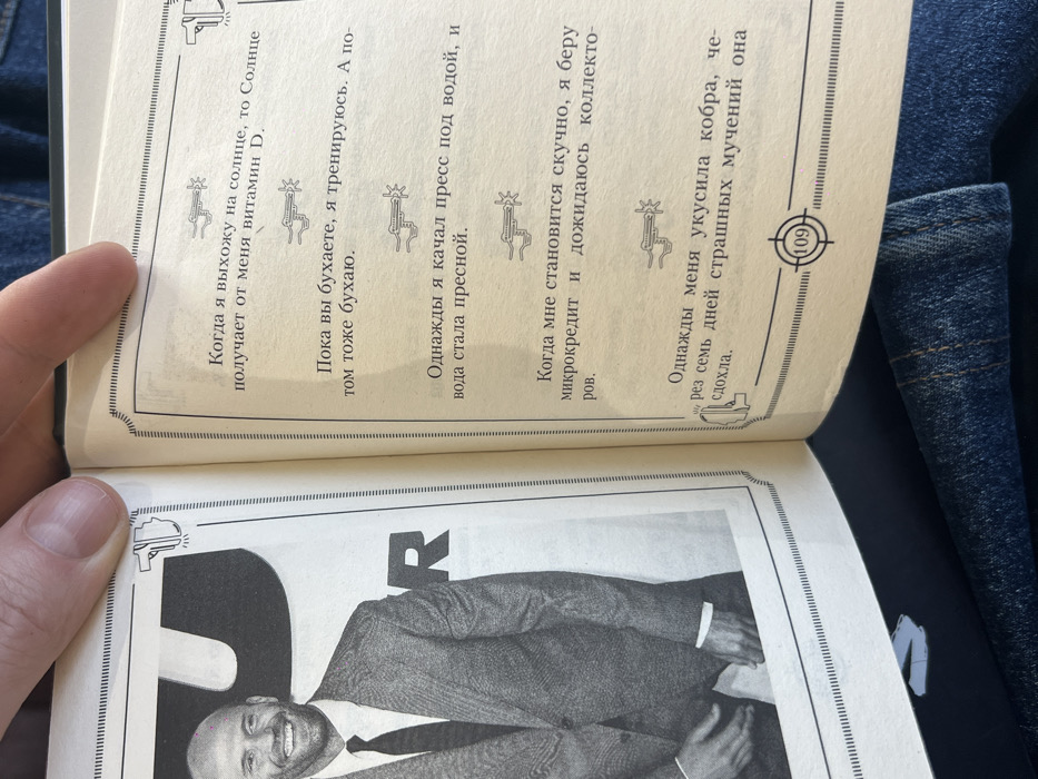 A book is held open by a person's left thumb and index finger, revealing two adjacent pages against a backdrop of blue denim jeans. The left page displays a black and white photograph of actor Jason Statham, depicted from the chest up, smiling and wearing a dark suit with a tie. A large, partially obscured letter "R" is visible in the background of the photograph. The page is bordered by a double-line frame with a small, stylized pistol icon in the upper right corner. The right page features multiple paragraphs of text printed in Cyrillic script (Russian language) on a light background, interspersed with small illustrations resembling ray guns between paragraphs. The page is also bordered by a double-line frame, including a stylized pistol icon in the upper right and lower left corners. At the bottom center of the right page, the number "109" is enclosed within a target-like graphic. The book is positioned over a person's lap, covered by blue denim material. The scene is indoors with ambient lighting. A specific location within the city of Hrodna, Belarus, is not discernible from the visual information provided.