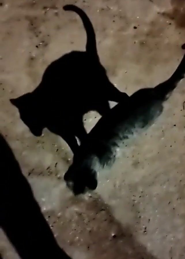 two dark cat figures on a light surface. The camera moves up, revealing the surface to be sandy or muddy with scattered debris. The camera angle shifts, and the video ends with a blurred, dark image of the cat figures.