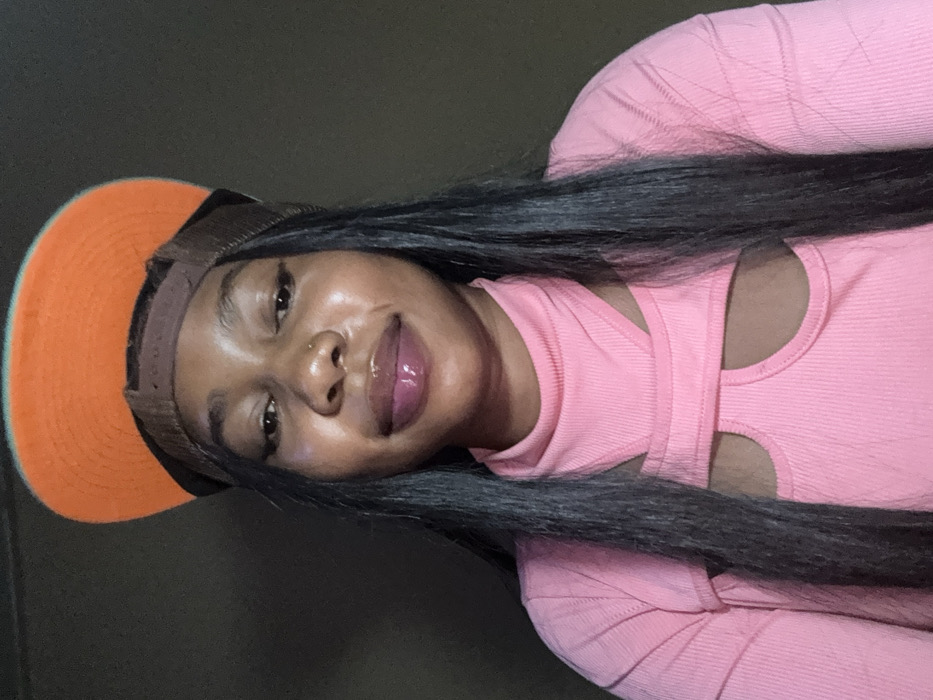A woman with long, straight black hair wears a pink long-sleeved shirt with cutouts. She wears an orange and brown baseball cap tilted slightly to the side. Her lips are glossy, and she has a nose piercing. The background is a dark, solid color. The image is slightly rotated.
