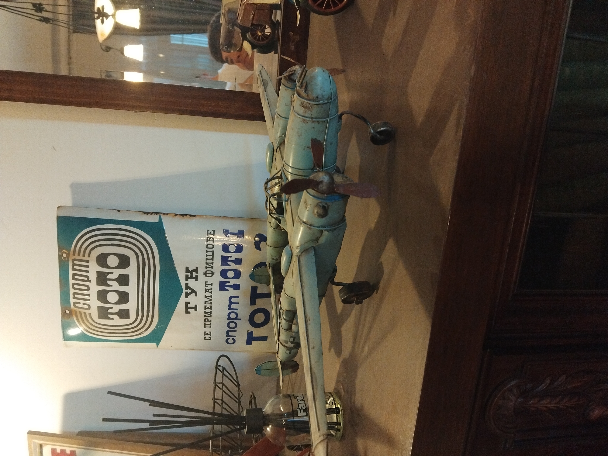 shelf with several items, including a vintage tin toy airplane, a sign with the word "TOTO" in Cyrillic script, a decorative fan, and a reflective surface indicating a mirror. The toys and sign appear to be of Eastern European origin, potentially from the former Yugoslavia, based on the Cyrillic text. The surrounding environment suggests an indoor setting, possibly a display or collection in a home or antique shop. The location is presumed to be Asenovets, Bulgaria, based on user prompt, however, visual indicators in the image do not specifically confirm the location.