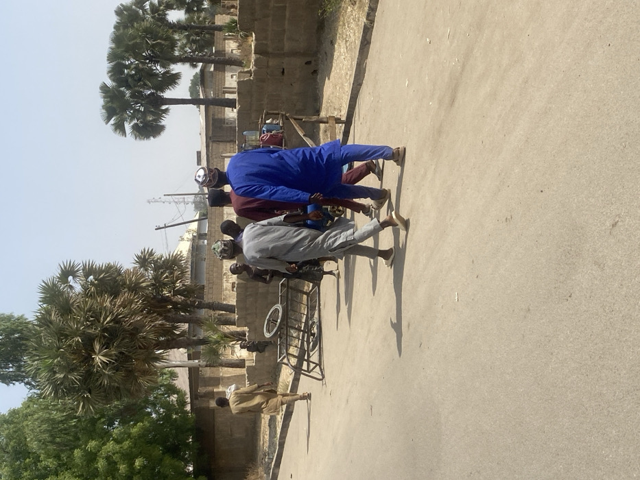 The image depicts an outdoor street scene in Hanwa, Nigeria, under a clear, sunny sky. A paved road occupies the foreground and mid-ground. Approximately eight to nine male individuals are present. In the mid-ground, a group of five adult males is walking along the road. One male on the far left wears a tan tunic and trousers, carrying a white item on his left shoulder, walking towards the left. Ahead of him, a male in a grey tunic and trousers, wearing a patterned cap and white sandals, walks towards the right. Immediately behind him is a male in a maroon tunic and trousers. To their right, a male in a bright blue tunic and trousers, wearing a patterned cap, is pushing or carrying a small, two-wheeled wooden stand that holds two plastic water bottles and a red jerrycan. A dark-colored metal frame, possibly a cart or barrier, lies on its side in the road, with a detached wheel or circular metal rim resting on it. In the background, several younger males are visible near a low, light-colored block wall. The environment includes numerous tall palm trees and other green foliage, along with various low-rise buildings and structures, some appearing incomplete or in disrepair. A utility pole with power lines is visible against the light blue sky. Distinct shadows are cast on the road surface.