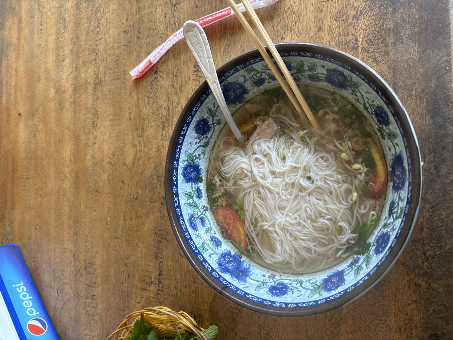 A bowl of noodle soup with chopsticks and a spoon on a wooden table. The bowl has a blue and white floral pattern. Other items on the table include a straw wrapper, a Pepsi packet, and a basket of herbs. The soup contains bean sprouts, tomatoes, and meat. The noodles are white and thin.
