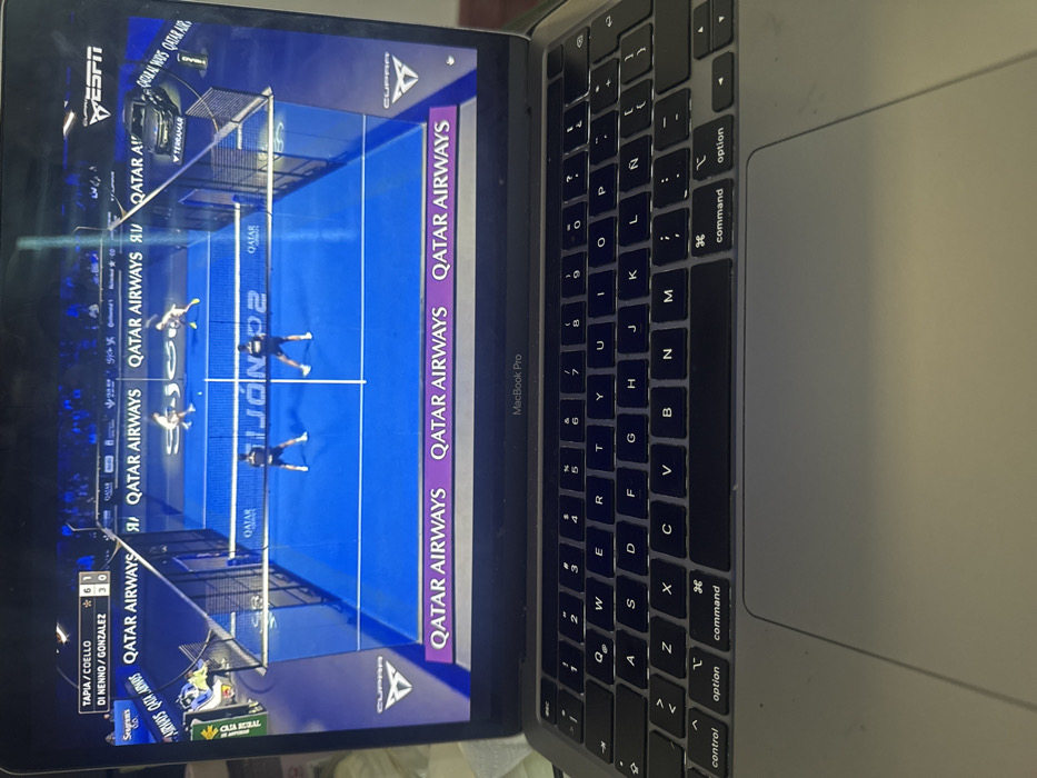 A silver-colored MacBook Pro laptop is shown from a frontal, slightly elevated perspective, displaying a Padel tennis match on its screen