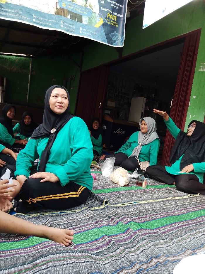 A group of Muslim women wearing hijabs and teal shirts are sitting on a patterned mat outside a building. One woman has her arm raised. There are snacks like a bag of crackers and a glass of tea on the mat. A banner is overhead advertising "Usat Informasi Umrah" and a branch office of "Pati." An "Aice" branded ice cream freezer is visible behind them in a dark room.