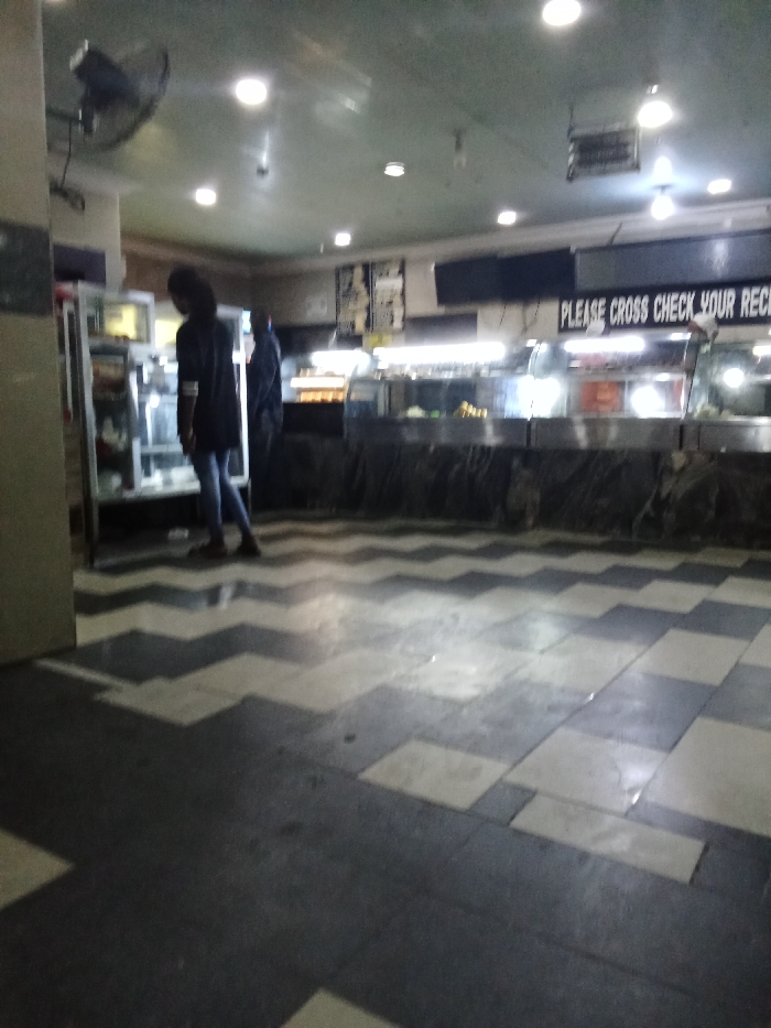 interior of a food service establishment in Ovwian, Nigeria, located at coordinates 5.503 latitude and 5.799 longitude. There are two people in the image. One person is standing near the back of the establishment, facing a glass display case filled with food. The second person is walking toward the display case. The display case has a sign above it that reads "PLEASE CROSS CHECK YOUR RECEIPT." The floor is tiled with a black and white checkered pattern. There are overhead lights and a ceiling fan in the room. The walls are painted white. The image was taken from the perspective of someone standing near the wall at the left side of the image.