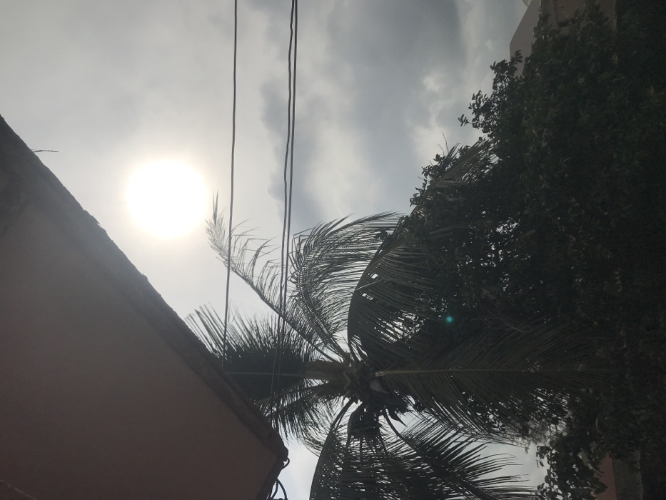 The image depicts an outdoor scene in Idah, Nigeria, under an overcast sky with a prominent sun. In the upper left quadrant, the underside of a brown-colored overhang or roof edge is visible, angled diagonally. The upper-central and right portions of the frame show a bright, circular sun partially obscured by light grey clouds. Below the sun, two dark, parallel electrical or communication wires stretch horizontally across the mid-ground. A large palm tree, likely a coconut tree, with numerous fronds and a cluster of green fruits near its crown, dominates the left and central foreground. To the right and below the palm tree, dense green foliage from other trees or bushes is present. A faint, reddish-brown structure, possibly a distant building roof, is partially visible on the far right horizon, behind the trees. No individuals or specific actions are discernible. A small, cyan-blue lens flare is visible in the lower-middle left area.