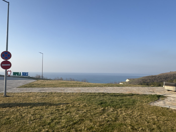 This image captures an elevated coastal view in Topola, Bulgaria, under a clear, pale blue sky