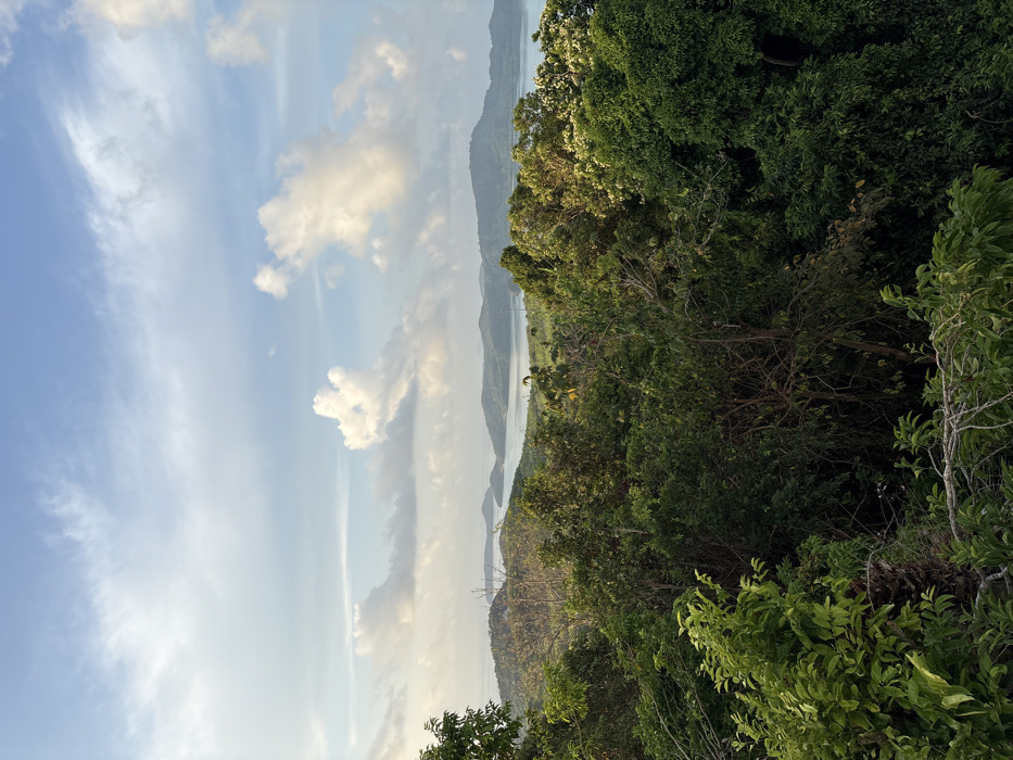 The image displays a panoramic landscape observed from an elevated position in Wichit, Thailand. The upper portion of the frame features a light blue sky with scattered white cumulus clouds. Below the sky, the mid-ground presents a series of verdant, tree-covered hills or islands separated by stretches of light blue-grey water, indicative of bays or inlets. The foreground is filled with dense tropical vegetation, composed of various green trees and shrubs, obscuring any immediate ground-level features. No individuals, man-made structures, or actions are discernible within the frame. The scene is illuminated by natural daylight.