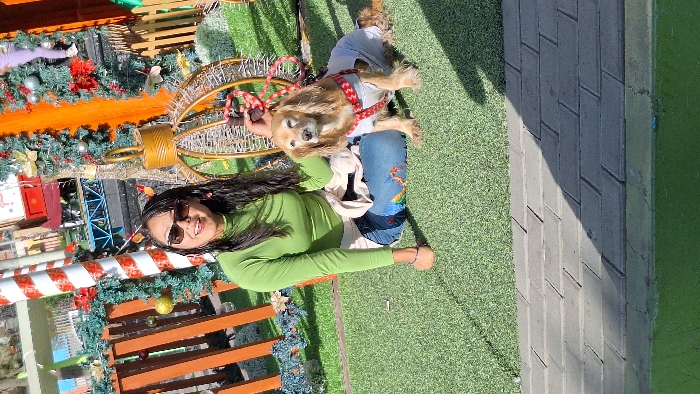 A woman in a green top and sunglasses sits with a Cocker Spaniel wearing a white shirt and red harness on her lap. The pair is outdoors, likely at a Christmas-themed event, with decorations visible in the background including a large ornamental bulb and garland on a railing. The scene is on artificial grass next to a paved area.
