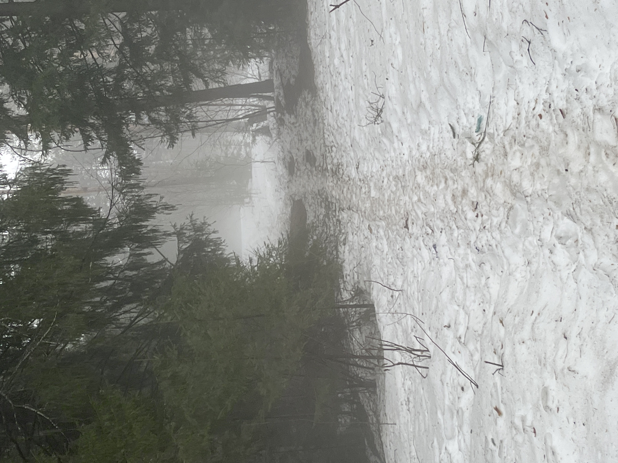 The image depicts a snowy path in a wooded area. Dense fog obscures the background. The trees on the left are coniferous, with dark green foliage. The path is covered in uneven, textured snow, and scattered twigs and branches are visible. There is no evidence to suggest the location is in the city of Марковский, Russia.