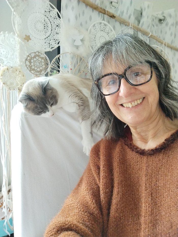 An adult female is depicted in an indoor setting, smiling and looking directly at the camera. She wears dark-framed eyeglasses and a textured, rust-colored long-sleeved top with a dark trim around the neckline. To her left and slightly behind her, a domestic cat with cream-colored fur and darker gray-brown points (ears, face, paws) is resting on a white surface, facing downwards and away from the camera. The background features a collection of white and cream-colored textile decorations, including several dreamcatchers of varying sizes and patterns, and a small white angel figurine. These items are suspended, partially from a natural wooden branch, against a white curtain with a subtle grey geometric pattern. The specific location within Montélimar, France, cannot be determined from the visual information presented.