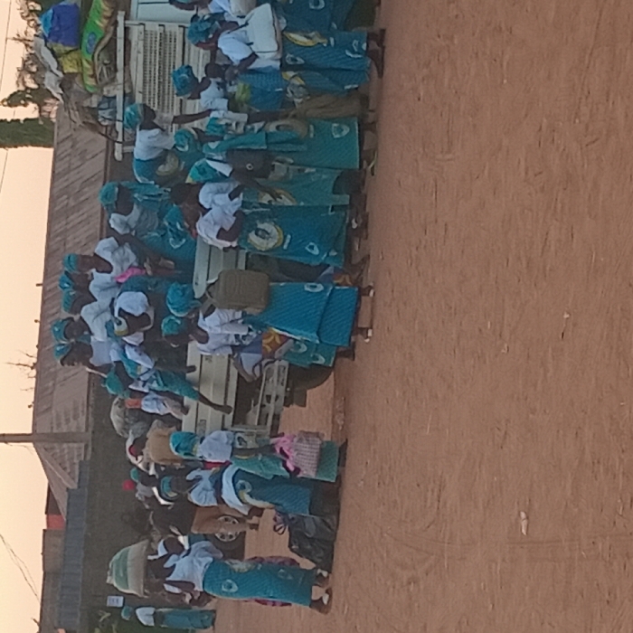 A crowd of women, dressed in turquoise and white attire, surround a parked truck. Most of the women wear white head coverings. The truck bed appears filled with bags and luggage. The scene unfolds on a sandy ground with a building visible in the background. The image, captured with a slight tilt, conveys a sense of community.