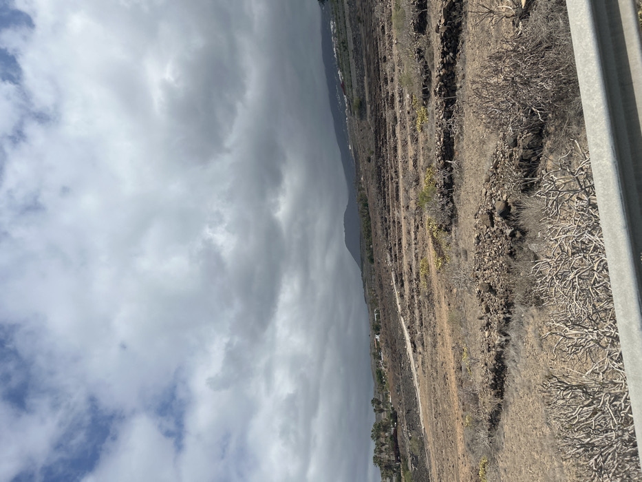 view of a landscape in Adeje, Spain, with a large, cloudy sky above. The landscape consists of an arid, rocky area with numerous rows of dry brush and a low stone wall separating them. The stone walls are likely meant to prevent erosion. The sky is a mix of blue and gray, with some clouds looking dark and stormy. The image appears to have been taken from a car, as a metal guardrail can be seen in the foreground. In the distance, there is a line of dark green vegetation, as well as a dark-colored volcanic mountain range. The image was taken from the outskirts of the city of Adeje, Spain. The coordinates provided in the request (latitude: 28.14, longitude: -16.784) indicate a location in the southern part of Tenerife, in the Canary Islands.
