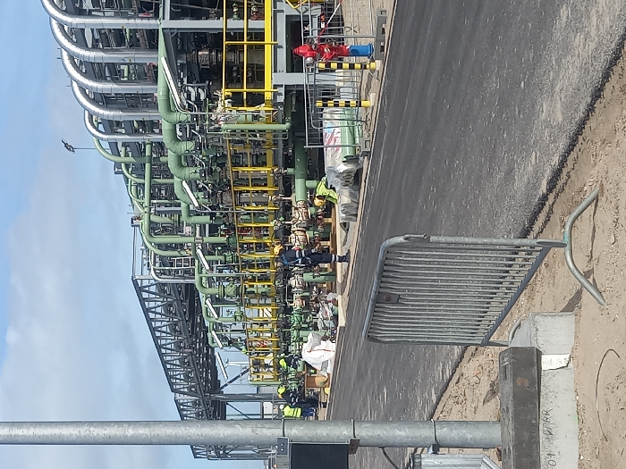 The image depicts an industrial facility, specifically located in Maasvlakte Rotterdam, Netherlands. The scene is observed during daytime under a partly cloudy sky. In the foreground, a tall, vertical grey metallic pole is positioned on the left. Centered in the foreground is a silver metal crowd control barrier with vertical slats, resting on sandy ground. An asphalt road surface runs horizontally across the mid-foreground, separating the sandy area from the main industrial complex. The midground is dominated by an extensive industrial processing or pipeline structure composed of multiple levels of interconnected pipes, primarily painted green. Some pipe sections are insulated with a silver material. These pipes are supported by a framework of grey structural steel, featuring yellow safety railings and platforms. Approximately seven individuals are present within the industrial complex. They are attired in industrial safety gear, including hard hats (yellow, white), high-visibility vests or jackets (yellow, green), and work trousers (blue, dark). Their positions suggest active engagement in tasks around the piping, with individuals observed kneeling, crouching, and standing. Various materials are visible on the ground within the complex: white industrial sacks are scattered near the workers and piping, and bundles of material wrapped in green plastic sheeting are also present. On the right, a red fire hydrant with a blue base stands behind a black and yellow striped barrier. In the background, a large, horizontal grey metal truss structure spans above the main equipment. Distant, indistinct industrial elements are visible against the horizon.