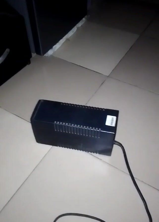 black uninterruptible power supply (UPS) on a tiled floor. The UPS has a power cord connected to it. Initially, an electronic buzzing sound is audible. A hand briefly enters the frame. The camera focuses on the top and side of the UPS, displaying its ventilation slats and a sticker. The buzzing sound persists.