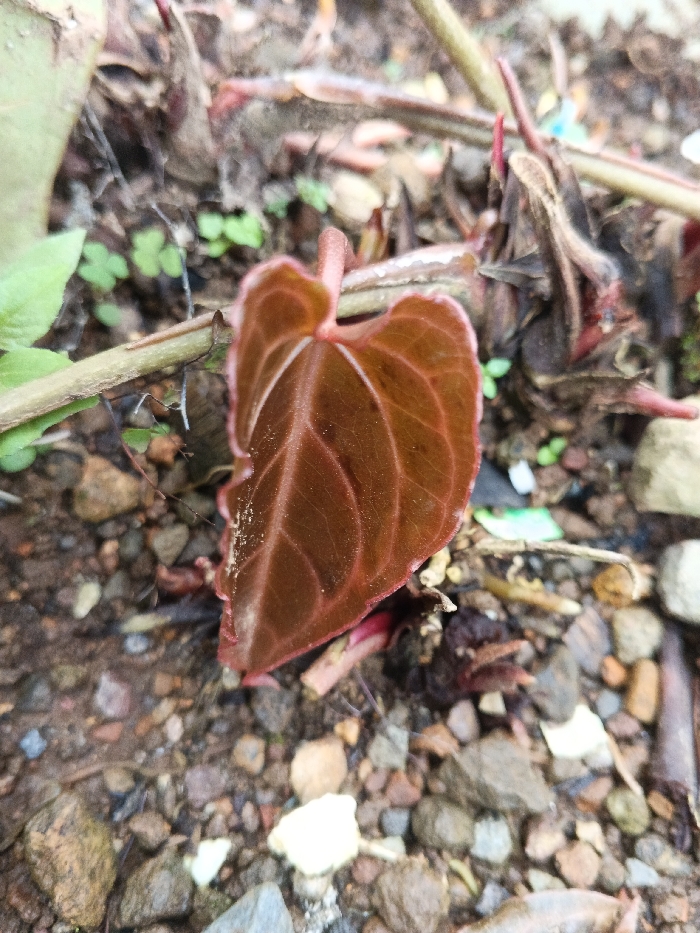 A close-up captures a reddish-brown, heart-shaped leaf with pronounced veins. The leaf is surrounded by small rocks and pebbles of varying colors, mostly shades of brown and gray. Other plant matter is visible, including a green stem, tiny green leaves, and dry, brown foliage. Some cobwebs are also present. The leaf appears to be on the ground.