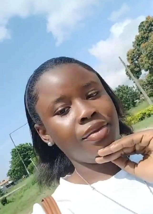 A young, dark-skinned woman with a black headband poses for a selfie outside on a sunny day with scattered clouds. She wears a white t-shirt with blue and orange designs, a silver necklace, and small diamond earrings. She holds her hand to her chin and then poses by puckering her lips and holding up an open hand. In the background, there is a green field, a paved road, other people walking, trees, buildings, and a utility pole.