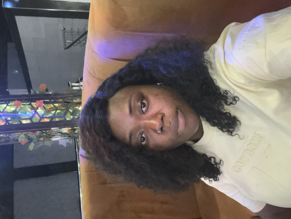 A person is seated on an orange couch, wearing a yellow sweatshirt with the word "Cowboys" embossed on it. Their curly black hair frames their face, which features a nose piercing. To the left, a railing adorned with hexagonal metal shapes and illuminated with blue and white lights is visible, along with some artificial flowers. The background suggests an indoor setting, possibly a restaurant or lounge area. The photo is taken at an angle, giving a casual, candid feel.