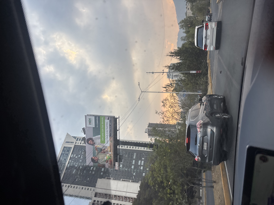 The image depicts an urban street scene captured from inside a vehicle, looking forward through a smudged windshield. The lower portion of the frame shows the vehicle's dark dashboard and the top edge of an infotainment screen. In the midground, a multi-lane asphalt road is visible. A dark gray Nissan X-Trail SUV with license plate 779-ALY is positioned directly ahead in the left-center lane, facing away from the viewer. Further ahead in the right lane, a white Honda Odyssey minivan (license plate NWN-32-0) also proceeds away from the viewer. Other vehicles are faintly visible further down the road. The road is bordered by a yellow-painted curb on the left and dense green foliage on both sides. In the background, a tall, modern multi-story building with a dark facade and glass windows dominates the left side of the skyline. A large billboard is centrally located in front of this building. The billboard displays an advertisement for "HDI Seguros" with the text "TU COMPAÑÍA Ser uno con los demás, nos hace más fuertes," featuring two women appearing to share a meal. Numerous other buildings, some appearing to be under construction with visible framework, are interspersed among trees and utility poles with overhead wiring. Mountains are discernible on the distant horizon to the right. The sky is partially cloudy, exhibiting patches of yellow and orange light, indicative of either sunrise or sunset. The scene is located in Santiago Yancuitlalpan, Mexico.