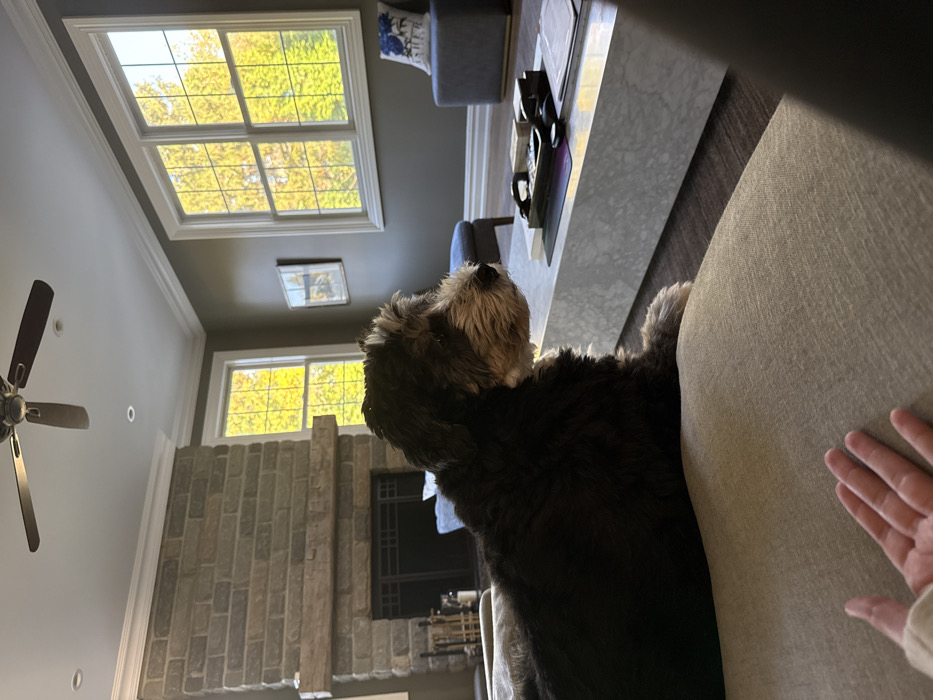 The image depicts a well-lit living room interior in Princeton, United States. A shaggy-haired dog, with dark brown/black fur and tan/gray markings on its face and legs, lies on a light beige upholstered sofa, facing towards the right side of the frame. In the lower-left foreground, a light-skinned human hand rests on the same sofa. The room features dark gray walls, a white ceiling with crown molding, and recessed lighting. A dark brown three-bladed ceiling fan is centrally mounted. On the left, a large stone fireplace with a thick wooden mantelpiece is visible, containing a dark grate and flanked by fireplace tools. Three large windows with white frames on the far wall allow bright natural light to enter, illuminating vibrant yellow-green foliage outside. A framed picture hangs on the wall between the left and center windows. A large, rectangular, light-colored coffee table occupies the center of the room, holding a dark tray containing several items, including what appear to be remote controls and documents. In the background, two gray upholstered cube ottomans are visible, one topped with a blue and white patterned throw pillow, along with a partially visible dark blue upholstered stool. The flooring is a dark tone, possibly carpet or wood. The dog is positioned as if observing something outside the frame to its right.