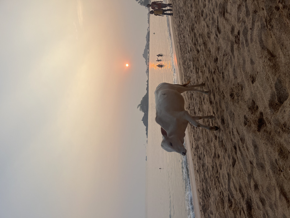 The scene depicts a sandy beach in Gokarna, India, during either sunrise or sunset under a hazy sky