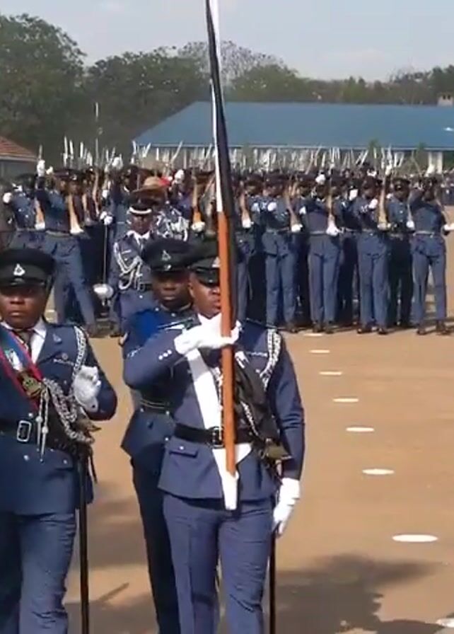 The video captures a formal parade ground scene, where a group of uniformed officers is marching