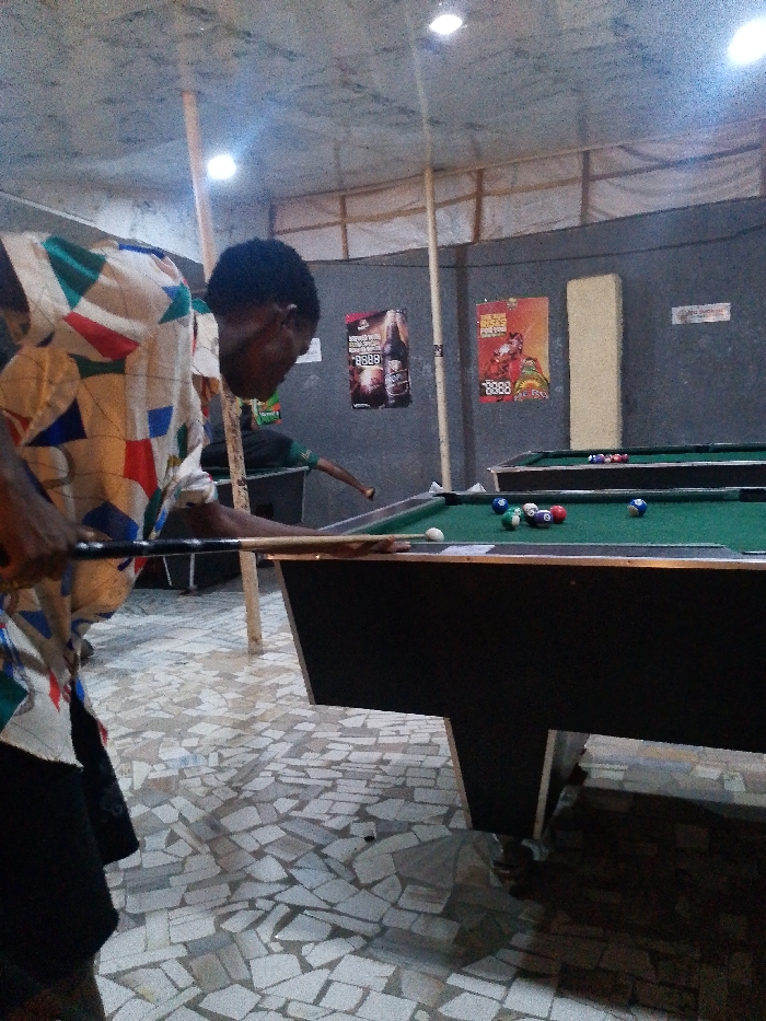 - "In a dimly lit room with a textured floor, a person in a geometrically patterned shirt aims a pool cue at the cue ball on a pool table" by FM-RLzNN2, licensed under CC BY 4.0
