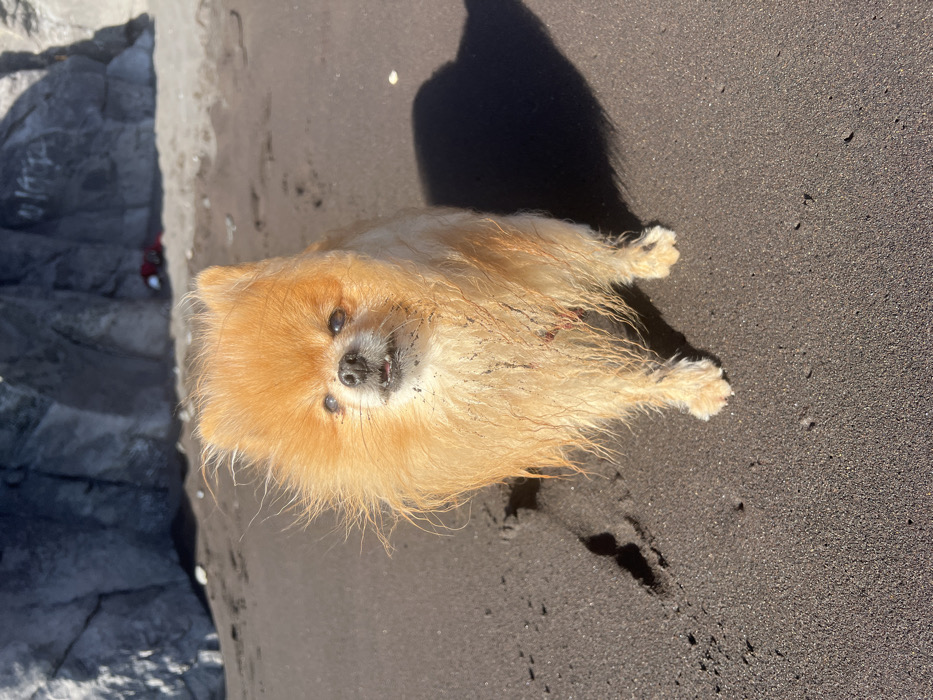 - "A small, golden-orange Pomeranian dog stands on a dark grey volcanic sand beach, facing directly towards the viewer" by FM-cvGYf2, licensed under CC BY 4.0