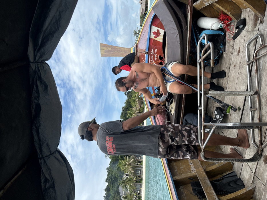 A traditional Thai longtail boat is depicted on clear turquoise water off the coast of Ban Ko Li Pe, Thailand. Three males are aboard. In the foreground, a barefoot male, wearing a dark grey t-shirt with red lettering ("HERBIES") and camouflage shorts, stands facing forward, looking towards the boat's interior. To his right, a shirtless male with visible chest tattoos and sunglasses sits on a brown padded bench, wearing white swim trunks and black socks, examining a diving mask and snorkel. A speargun lies on the wooden deck in front of him, alongside a blue dry bag, a white buoy, red rope, and black fins. Further forward, a younger male wearing a red and black long-sleeved top sits on the boat's bow, facing away from the camera. The bow is adorned with colorful paint, including a Canadian flag decal and handwritten text. In the background, a tropical coastline features a sandy beach, several resort-style buildings with dark roofs, and numerous palm trees, all against a lush green hillside under a blue sky with scattered white clouds. A dark fabric canopy partially obscures the top of the frame.