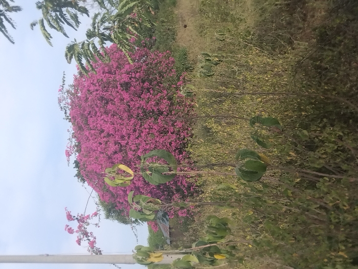 The image depicts an outdoor scene in West Uyoma ward, Kenya, under an overcast sky. In the midground, a large, dense bush or tree covered in numerous vibrant pink flowers dominates the center. To the left of this pink flowering plant, a slender, light-colored utility pole extends vertically from the bottom of the frame towards the top. Partially visible behind the flowering plant, towards the left, is a portion of a structure with a dark roof. The foreground consists of an expanse of mixed vegetation, including numerous green and yellowish-green plants and stalks, some with distinct large, rounded green leaves. A branch with green leaves is partially visible on the far right. No human figures or discernible animal life are present.