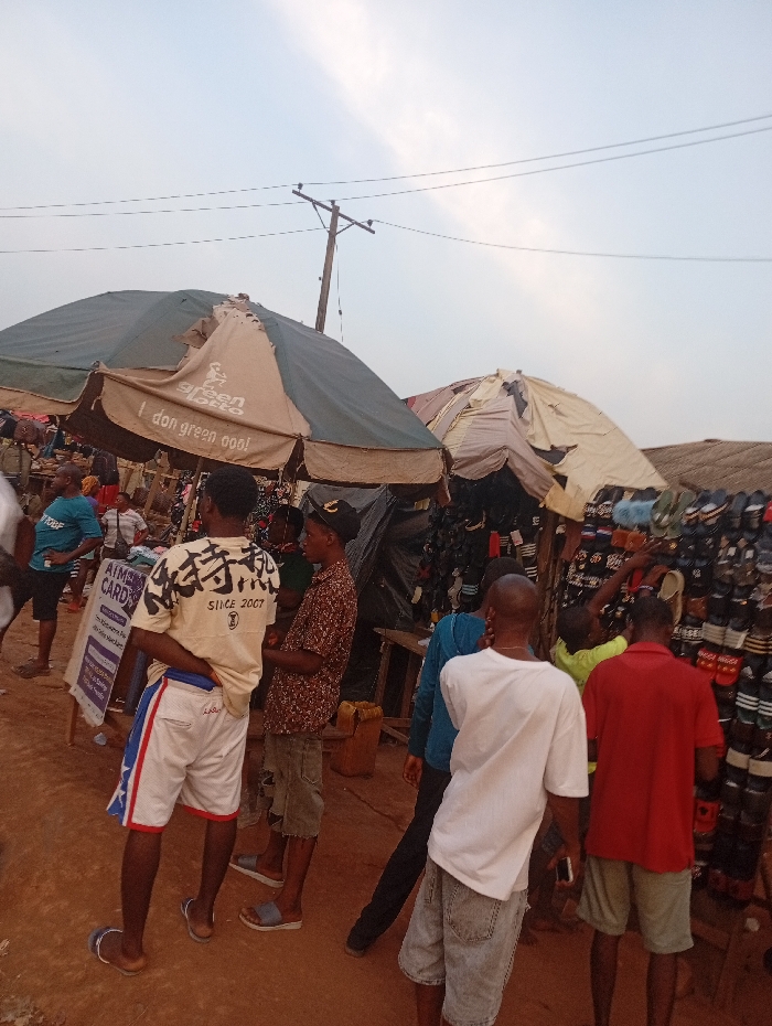 A bustling outdoor market under tattered umbrellas fills the frame. Several men stand around, some browsing goods. The ground is a reddish dirt. A sign reading "AIMS CARDS" is visible. A utility pole stands in the background against a hazy sky. Clothes and sandals are prominent merchandise. The scene is active and crowded.