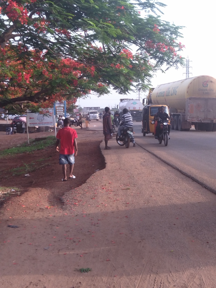 scene in the city of Kanshio, Nigeria, at the intersection of two roads. It is a sunny day, with a large tree in the foreground. The tree is in full bloom with red flowers. In the background, there is a large, white truck with a green and yellow logo that says "Greenville L.N.G." The truck is parked on the side of the road. The right side of the image shows a man driving a yellow motorcycle with a sidecar. The sidecar is occupied by another man. There are a few people standing by the roadside, some of them are dressed in casual clothing and some are dressed in work clothes. One man in the foreground is wearing a red shirt and blue jeans. The scene is likely a busy intersection in the city of Kanshio, Nigeria.