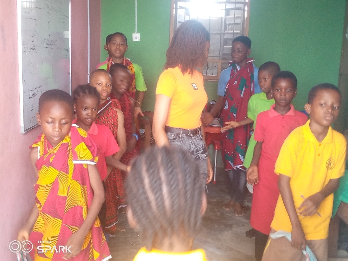 The image depicts an indoor scene within a room in Ajaokuta, Nigeria, populated by one adult female and approximately ten children
