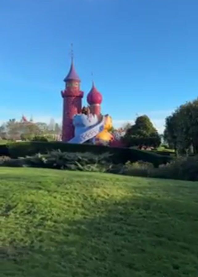 castle-like structure with towers and bright pink and blue colors. The structure is surrounded by green grass, hedges, and trees, all under a clear, bright blue sky. People can be seen walking on the structure, adding to the scene's liveliness.