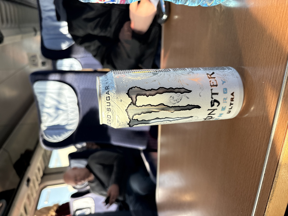 The image displays the interior of a passenger transport vehicle, likely a train or bus, with a focus on the foreground. A silver "Monster Energy Ultra" can, partially opened and covered in condensation, stands prominently on a light brown, wood-grain table surface. Visible text on the can includes "ZERO SUGAR + L-CARNITINE + B VITAMINS". In the background, rows of dark blue passenger seats with lighter headrest covers are visible. To the left, a bald man wearing a dark long-sleeved shirt is seated, engaged with a mobile phone he holds in his hands. To the right, another individual is partially visible from the chest down, wearing a dark jacket, with a light blue plastic water bottle positioned on the table adjacent to them. Natural light illuminates the scene from windows positioned to the left.